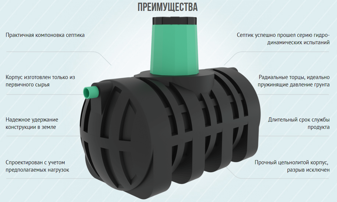 При периодическом или сезонном проживании пластиковый септик не нуждается в частой откачке и обладает рядом преимуществ относительно современных систем с биофильтрами и обычных сливных ям:
